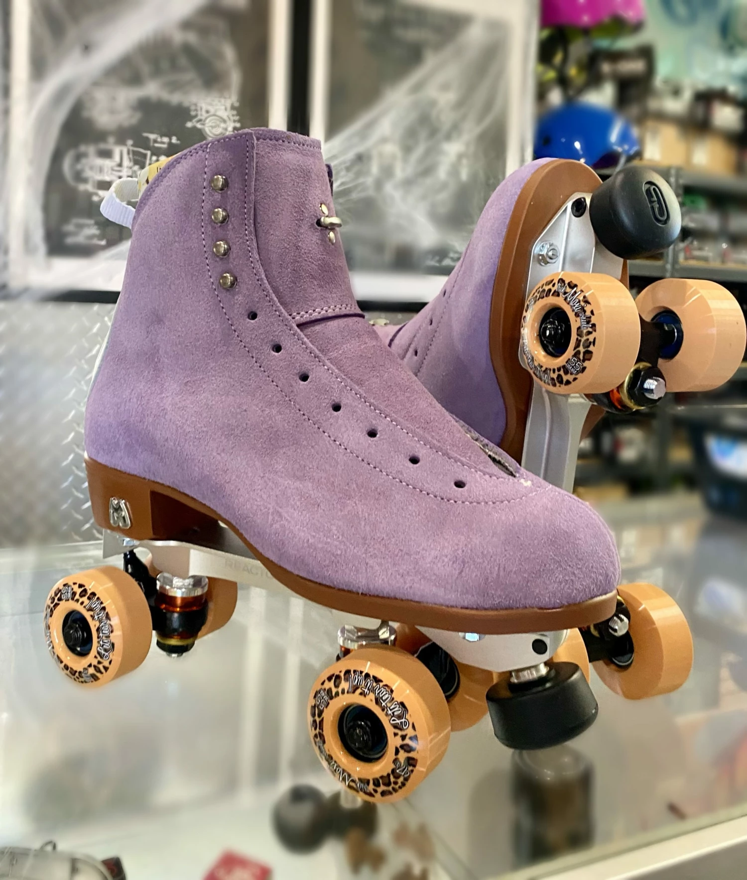 These custom made Moxi Jack skates include the custom color lab with original lining and combine classic roller skate design with modern materials and features to create a high-performance boot. The rich suede upper is backed throughout for additional support in all directions. Ankle padding and a soft, genuine Shearling tongue lining make the Jack as comfortable as it is strong, and a lace bar stabilizer helps prevent unwanted tongue rotation while skating. Thoughtful touches such as solid metal hooks, wax-infused laces, and a unique backstay design featuring the signature Moxi “M” round out the Jack and ensure that no detail is overlooked.