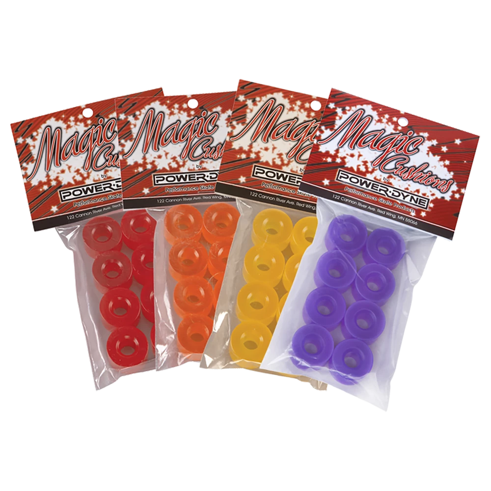 Unique to PowerDyne Magic Cushions is the Power Assistâ„¢ formula for total performance. Made from high-quality urethane, Magic Cushions (some people call them “bushings”) retain energy and release it when you need it most. Just like shocks on a car, Magic Cushions soak up the imperfections of the surface, keep you connected to the road ahead through enhanced feedback, load up when pressed to the limit, and then release your stored power in a forceful yet predictable manner. Available in multiple colors / hardnesses.