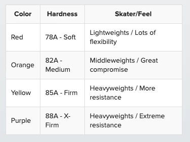 - Colors / Hardness: Available in Red (78A), Orange (82A) and Yellow (85A), Purple (X-Hard)